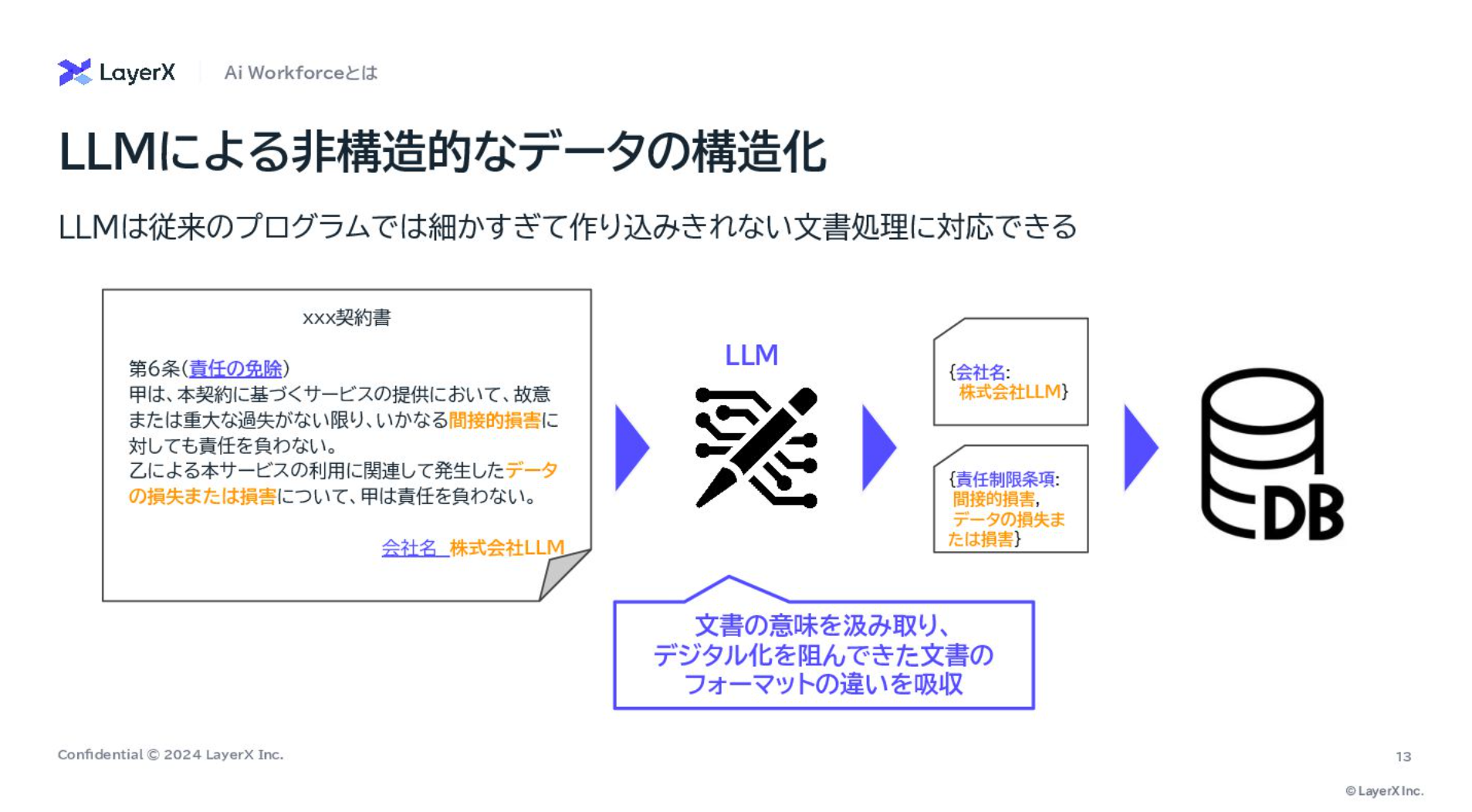 しかし、LLMの登場はこの状況に大きな変化をもたらしたのです。LLMはテキストを解析し、それに含まれる意味や関係性を抽出することで、自然言語で書かれた文書をソフトウェアでも処理できる「構造化データ」に変換してくれるようになったのです。この技術的ブレークスルーこそが、これまで自動化が困難だった「知的な重複作業」を大規模に効率化し、労働力不足という大きな課題を解決に導く、最大の機会であると私たちは考えています。