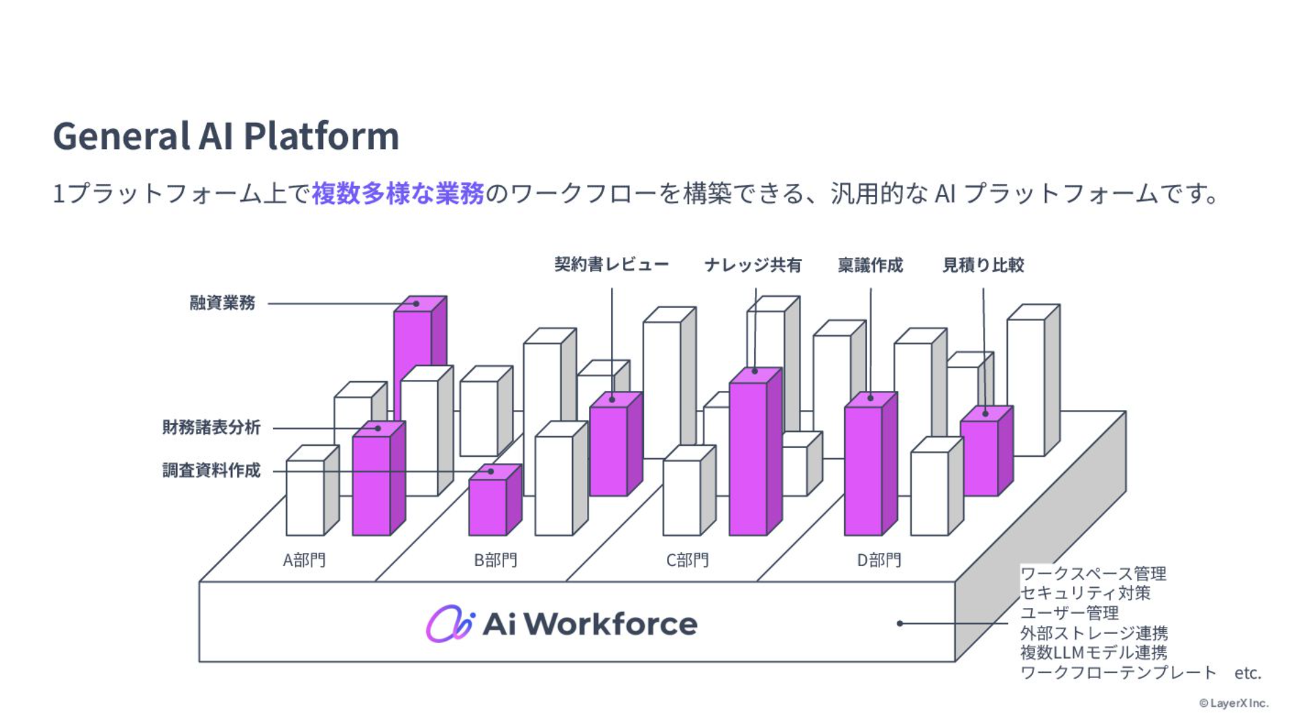 この機会を捉え、LayerXが提案するのは、特定の業務に特化した「垂直(バーティカル)」なツールではなく、経理、法務、営業といった部署や業務を横断して、汎用的に利用できる「水平(ホリゾンタル)」なAIプラットフォームです。