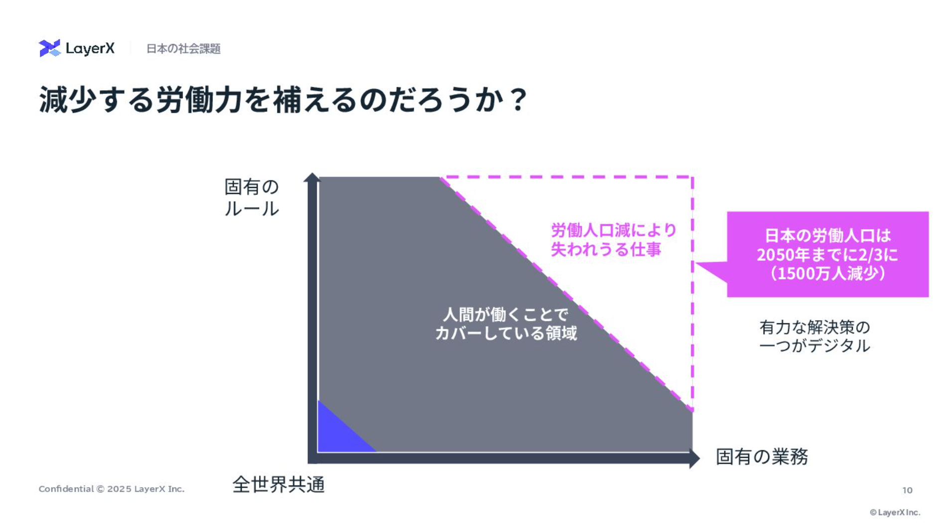 日本の社会課題に目を向けると、2050年には約1500万人もの労働人口が減ると言われています。これまで人の手でなんとか行ってきた業務が、物理的に立ち行かなくなる未来はすぐそこまで来ています。この課題に対してはDXやデジタル化の流れで多くの企業が対策を進めていますが、それらの多くは、業務全体から見れば「一部分の面と、本当に一部分の点でしか」課題を補えていないのが実情です。
