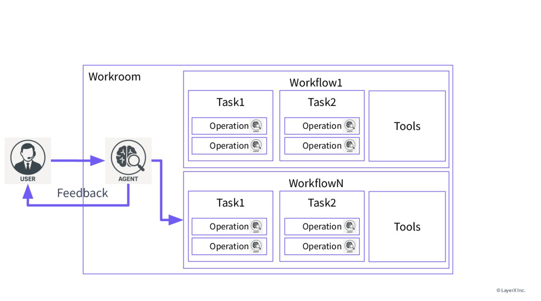 GUIのビルダー上で業務プロセスを複数のノード(処理)に分解してワークフローを構築し、ユーザーはチャットインターフェースを通じてAIエージェントに対話形式で指示を出すと、エージェントがその指示を解釈し、対応するワークフローを実行します。人間がエージェントと対話しながら、実際の作業は精度の高いワークフローが担う。一つのワークフローが完了したら、その結果や文脈を保ったまま、次のワークフローへと処理を引き継いでいきます。