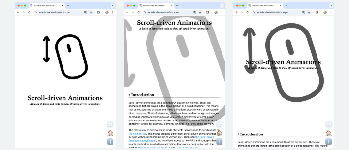 スクロール駆動アニメーションとは、時間経過によるアニメーションとは別の、ユーザーのスクロール操作によって発生するアニメーションです。Webサイト「Scroll-driven Animations」は、スクロール駆動アニメーションのデモサイトで、その動きを見るのに最適です。