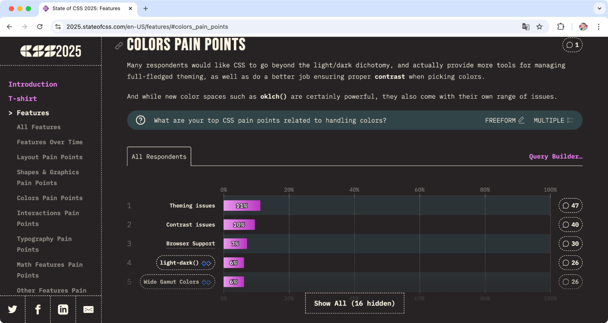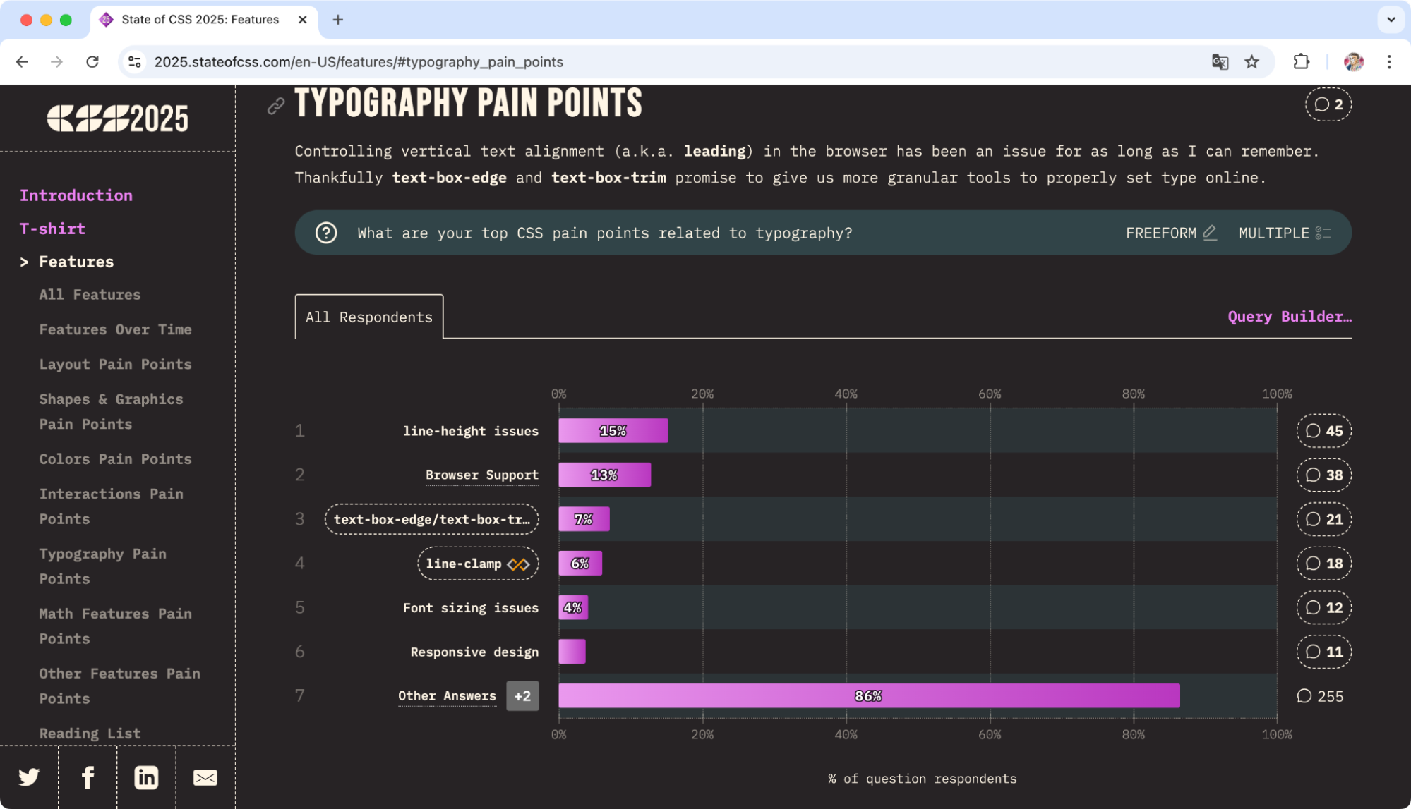 「Typography Pain Points」(タイポグラフィの問題点)は、タイポグラフィ(文字やフォント)における問題点のサーベイです。タイポグラフィといいながら、トップの「line-height issues」をはじめ、テキストのレイアウトにおける再現性を問題としている結果となっています。注目したいのは3位の「text-box-edge/text-box-trim」と4位の「line-clamp」です。