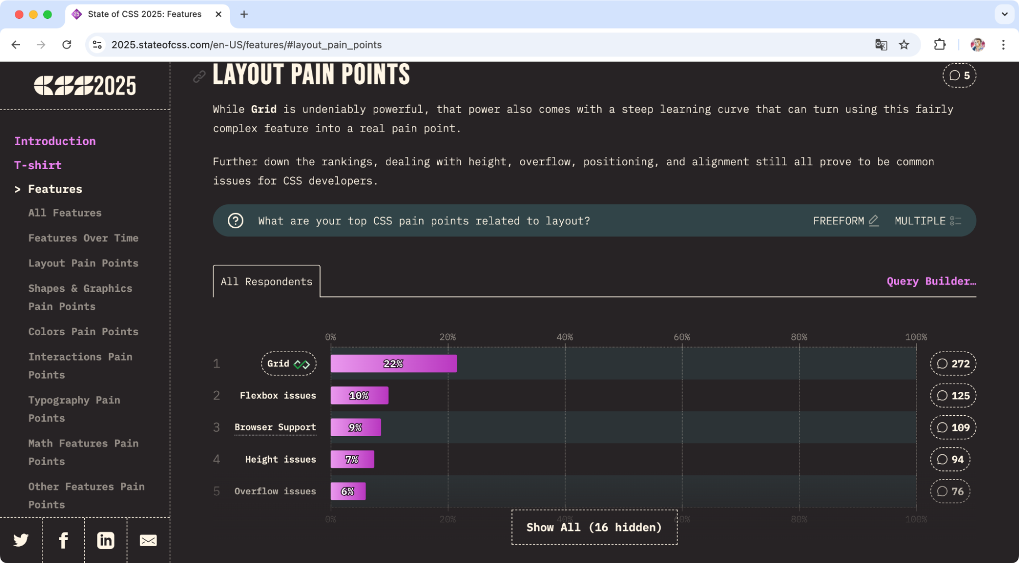 これを見ると、CSSグリッド(Grid)やフレックスボックス(Flexbox)の使いこなしに難ありという声が多いようです。両者とも、複雑なレイアウトをシンプルなマークアップとスタイル指定で可能にしてくれる優れものですが、それ故に機能の使いこなしや、細かな調整に苦労するといった局面が多いように思えます。