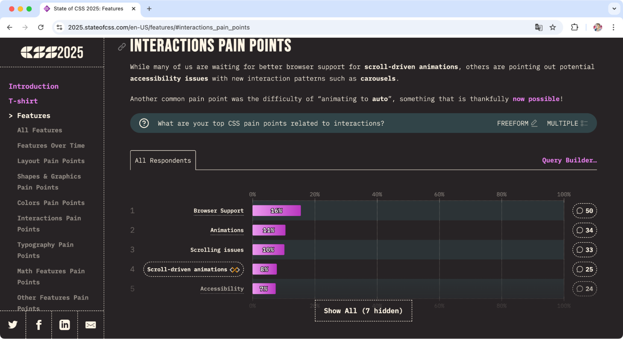 「Interactions Pain Points」(インタラクションの問題点)は、インタラクション(Webページとの対話機能)における問題点のサーベイです。注目したいのは、4位の「Scroll-driven animations」です。Limited Availabilityではあるものの、「スクロール駆動アニメーション」のブラウザサポートが進むことへの期待が高いことが読み取れます。