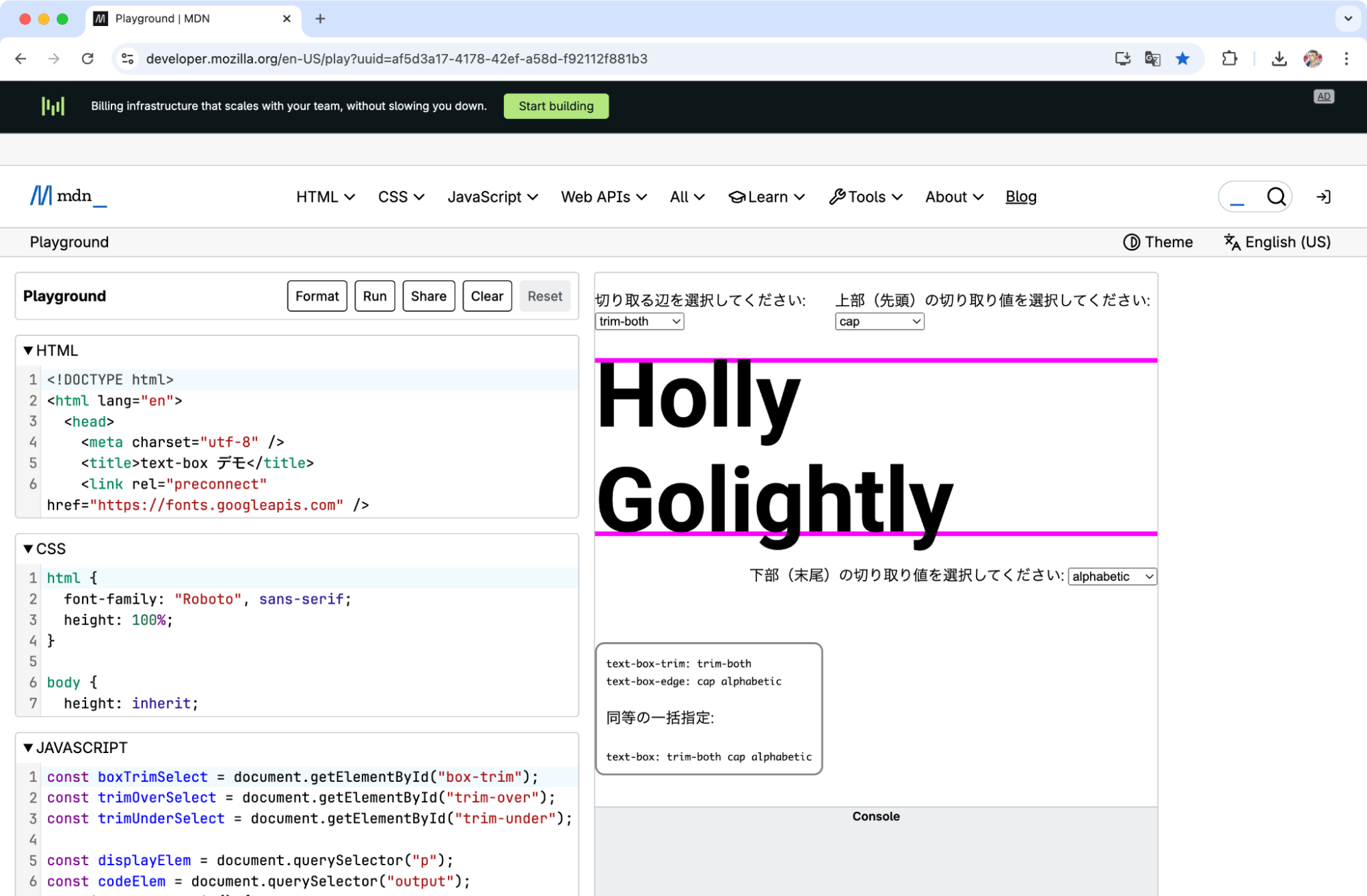 「text-box-edge/text-box-trim」は、テキスト上下辺のトリミング方法を指定できるようにすることで、テキストの見た目を整えやすくなる新しいプロパティです。通常、レイアウトされるテキストの高さは「レディング」と呼ばれる余白やフォントのデザインによって変わってくるので、見た目を意図どおりに整えることは難しいものです。text-box-edge/text-box-trimプロパティによってテキスト上下辺のトリミング方法を指定できるようになることで、テキストの高さをコントロールしやすくなることが期待されます。具体的な動作イメージとしては、例えば「Playground | MDN」において、「切り取る辺」「上部(先頭)の切り取り値」「下部(末尾)の切り取り値」を切り替えて試してみるとよいでしょう。ただBaselineはLimited Availabilityで、Firefoxなどのブラウザではサポートされていません。