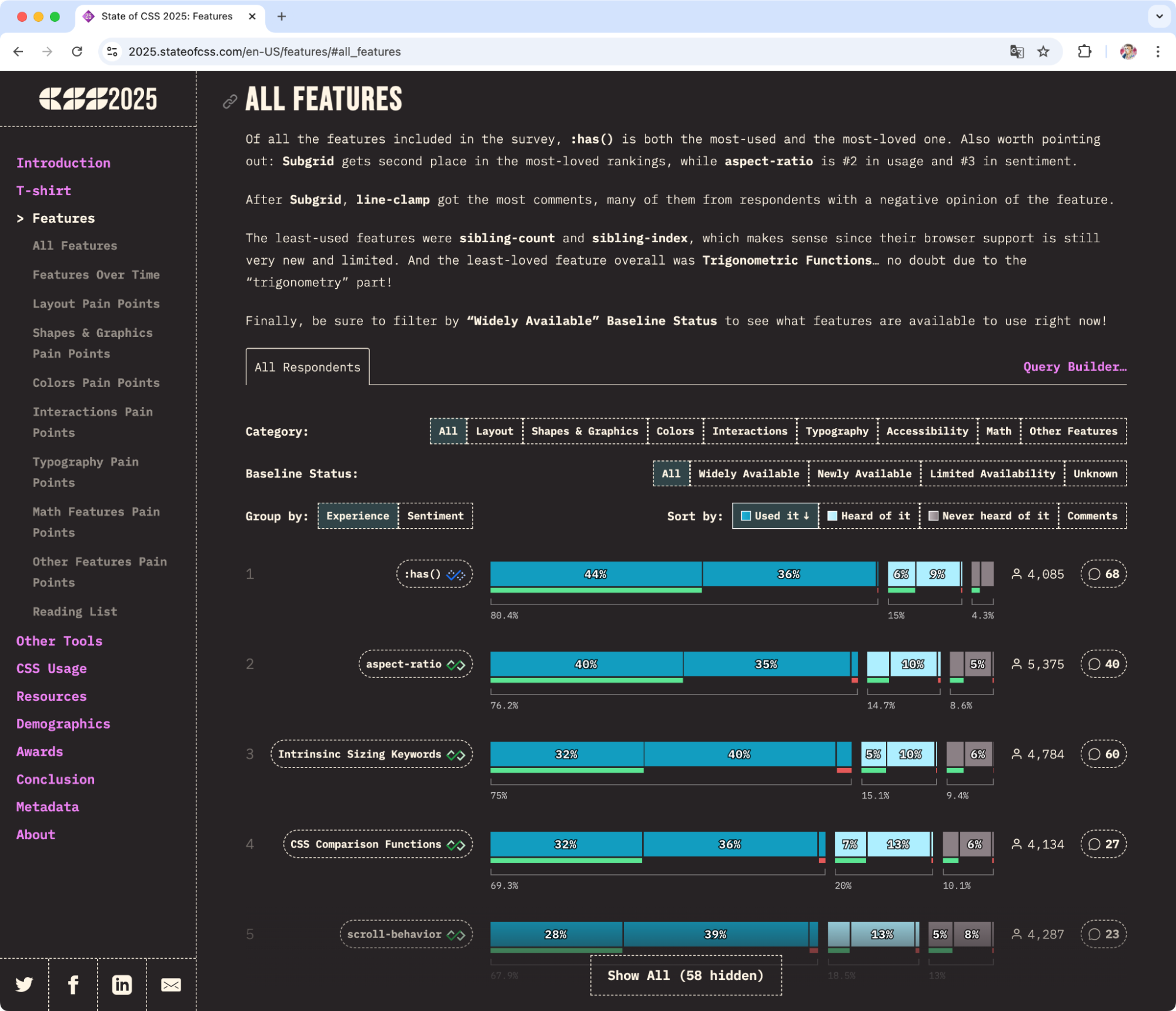 ここでは「::target-text」がトップですが、All Featuresでは57位で82.4%の回答者が「聞いたことがない」となっています。Baselineでは2024年におけるNewly Availableとなっていますが、実験的機能と位置付けられており、利用者が限られることから初めて目にする機能ということになったのだと思われます。