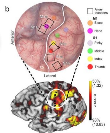 研究では、頸髄損傷により四肢麻痺となった40代男性の左脳に、合計5つの微小電極アレイを埋め込んだ。運動野(M1)には64チャンネルのアレイを2つ(計128電極)、体性感覚野(S1)には32チャンネルのアレイを3つ(計96電極)配置し、総計224個の電極で脳活動の記録と刺激を行う。
