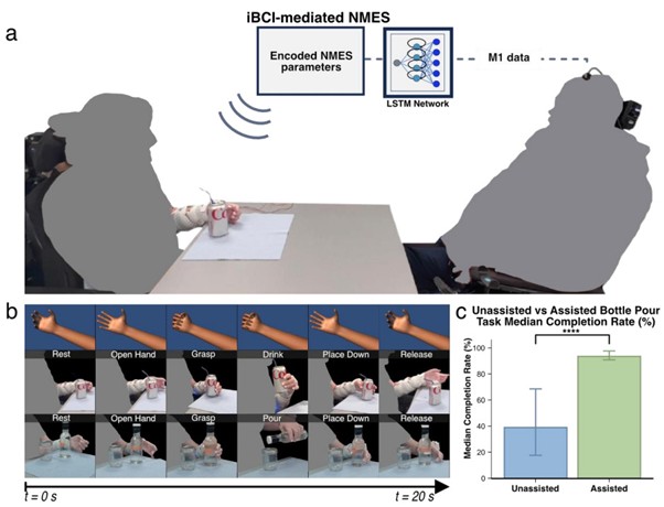 研究チームはさらに、2人の脊髄損傷患者間での協力的リハビリテーションという応用を実証した。四肢麻痺患者が、不完全脊髄損傷により上肢機能が低下した60代女性患者の手をブレインインターフェース経由で制御。水の入った700グラムのボトルを掴んで傾ける課題を共同で遂行した。女性患者が単独で行った場合の成功率は39%だったが、ブレインインターフェースを介した協力により94%まで向上した。