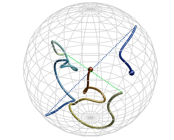 球の中心は回る前の中心点(回転なし、物体が元の状態のまま、恒等回転)と考える。連続的な回転は、そこをスタート地点として虫がリンゴの中をトンネルのように掘り進むように、球内をある点から別の点へと移動する軌跡として表現される。つまり、回転を元に戻すという目標は、球の中心に戻る経路を見つけることである。