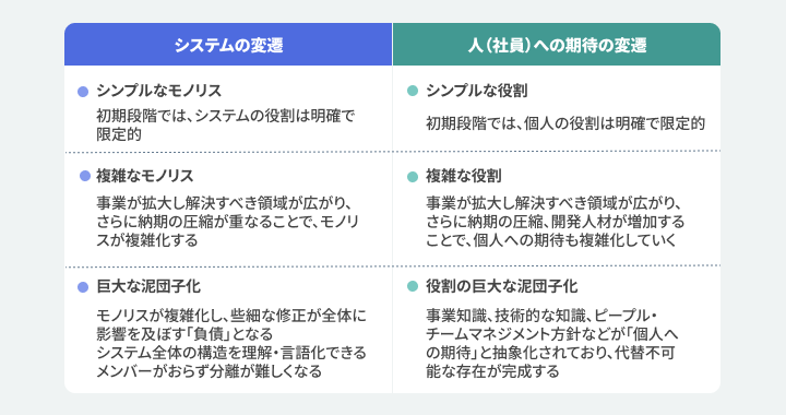 これは、無秩序に拡張・修正が繰り返された結果、全体像の把握や部分的な変更が極めて困難になったシステムを指します。そして、特定の個人に業務や期待が集中してしまいパンクに至るプロセスは、このシステムが形成される過程と驚くほどよく似ています。
