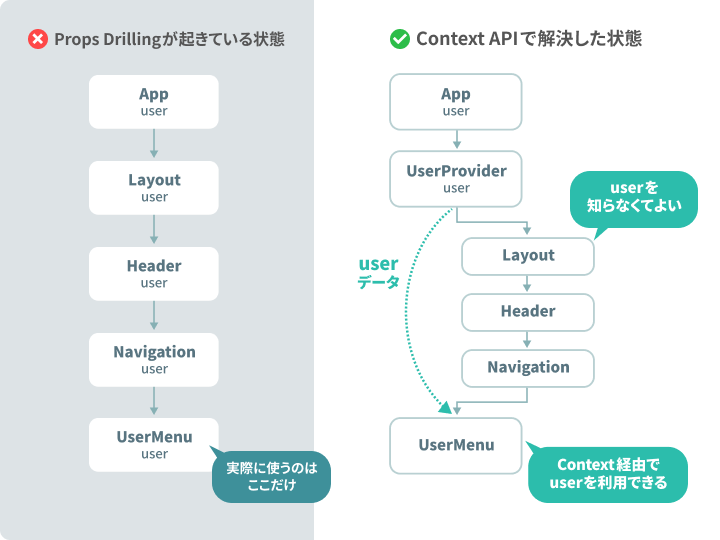 </UserContext> {/* 註: React 19からは.Providerが非推奨になりました */}