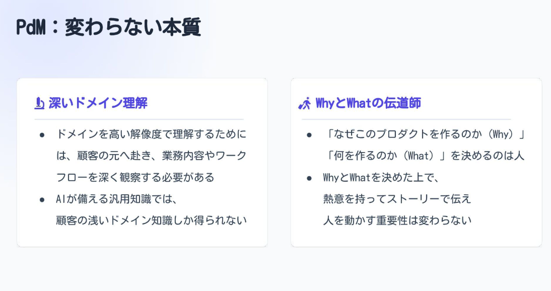 一方で、PMの「変わらない本質」もあります。「深いドメイン理解」の重要性は、いつになっても変わらないはずです。