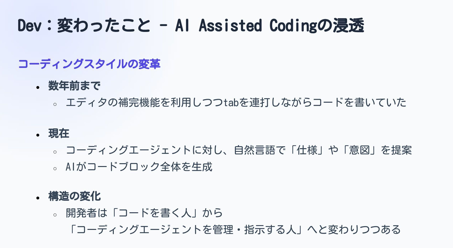 開発者の役割は「コードを書く人」から、「コーディングエージェントの管理者」や「指示を出す人」、つまり一種のマネジメント的な役割へと変化してきています。