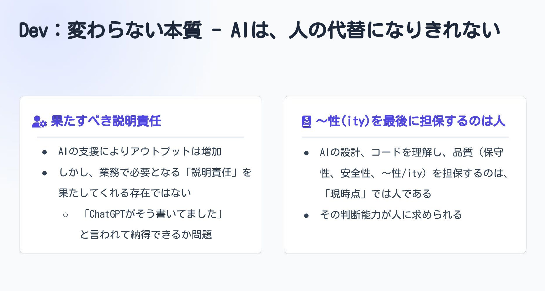 1つ目は「説明責任」です。以前、「ChatGPTがこう言っていたので、こうしました」というコードレビューのコメントが話題になったことがあります。そういったやり取りを、実際に見聞きしたこともあります。しかし、その説明をされたとして納得できるでしょうか。きちんと説明をすることは、これからも人に宿る重要な責務なのではないかと思います。