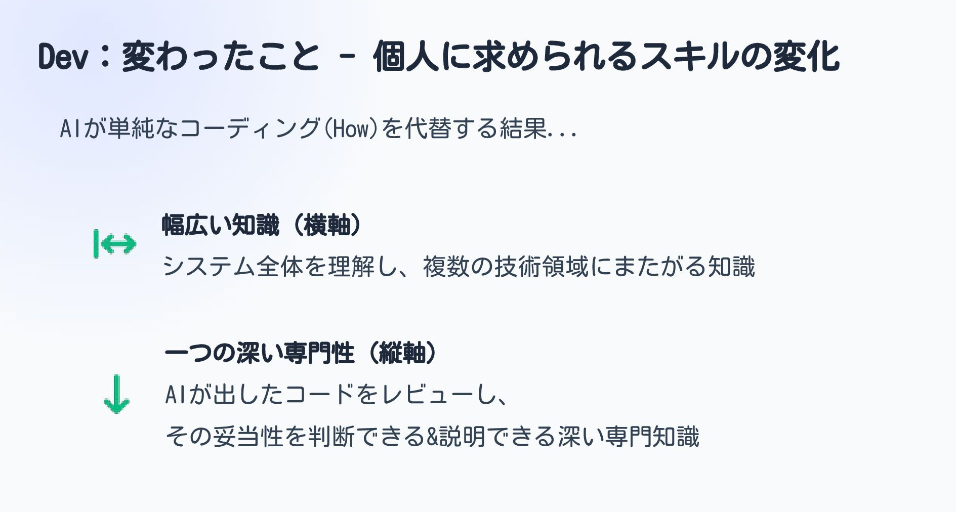 同時に、AIが生成したコードの妥当性を判断するための深い知識が求められます。T字型スキルの縦軸に例えられるように、「データベースなら誰にも負けない」「ネットワークならマニアックに語れる」といった専門性も重要です。これが、AI時代に変わったこと、これまで以上に求められるようになったことです。