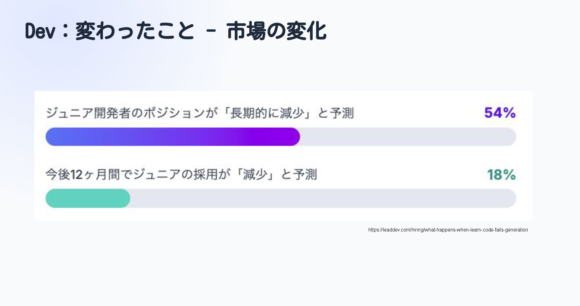 また、市場も変化しています。エンジニア向け情報プラットフォーム「LeadDev」が約880人を対象に行ったアンケートでは、半数以上の人が「ジュニアエンジニアの採用は長期的に減少する」と回答しています。求められるスキルや採用の基準が変わりつつあることが伺えます。
