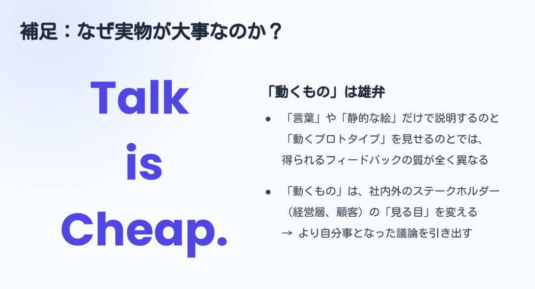 「紙芝居」「ポンチ絵」など、呼び方はいろいろあると思うのですが、いままではスライドやFigmaで絵を描いて、ユーザーにアイデアを説明していたと思います。しかし、v0やLovableなどにより、動くプロトタイプをすぐに作れるようになりました。