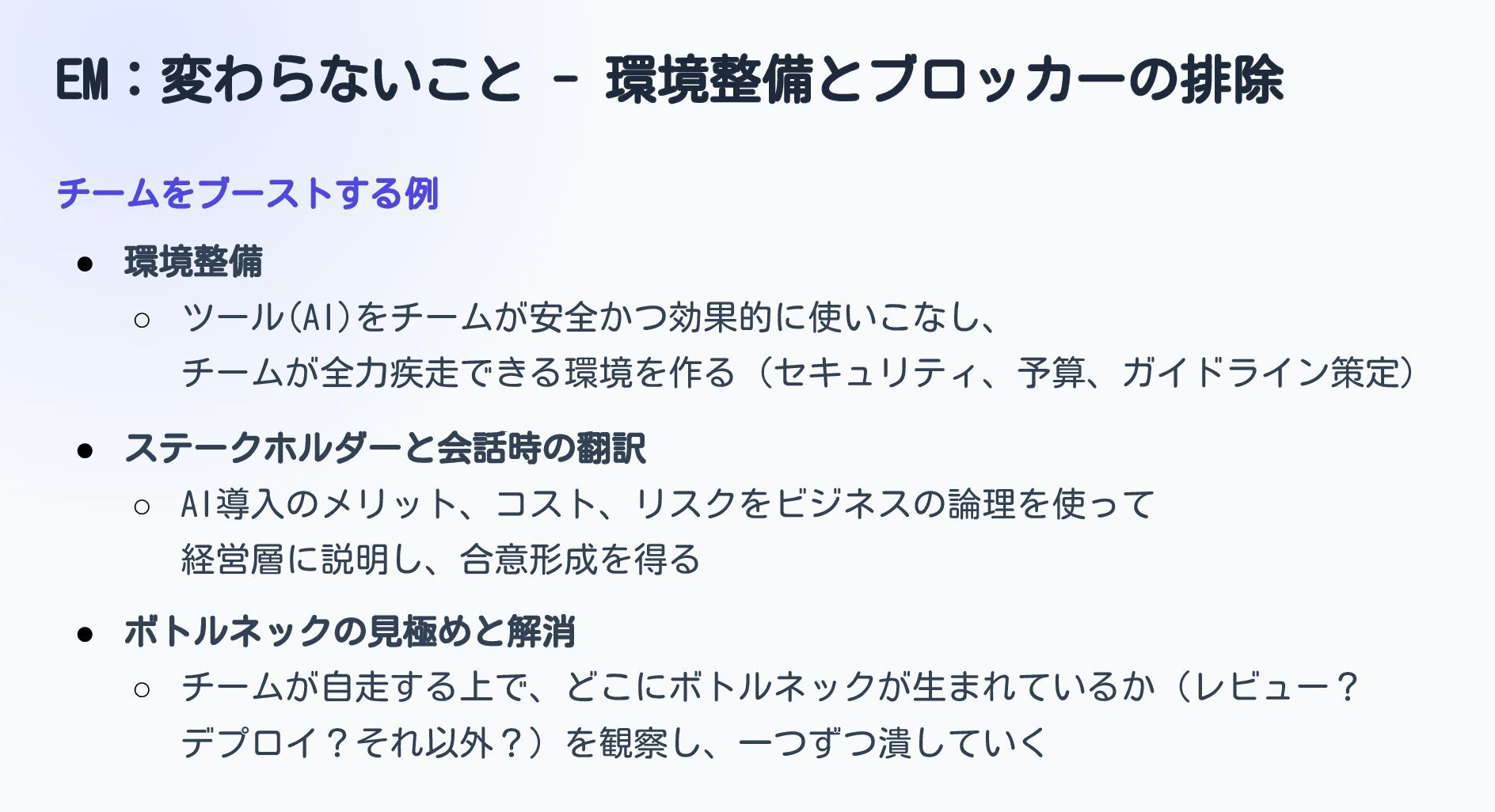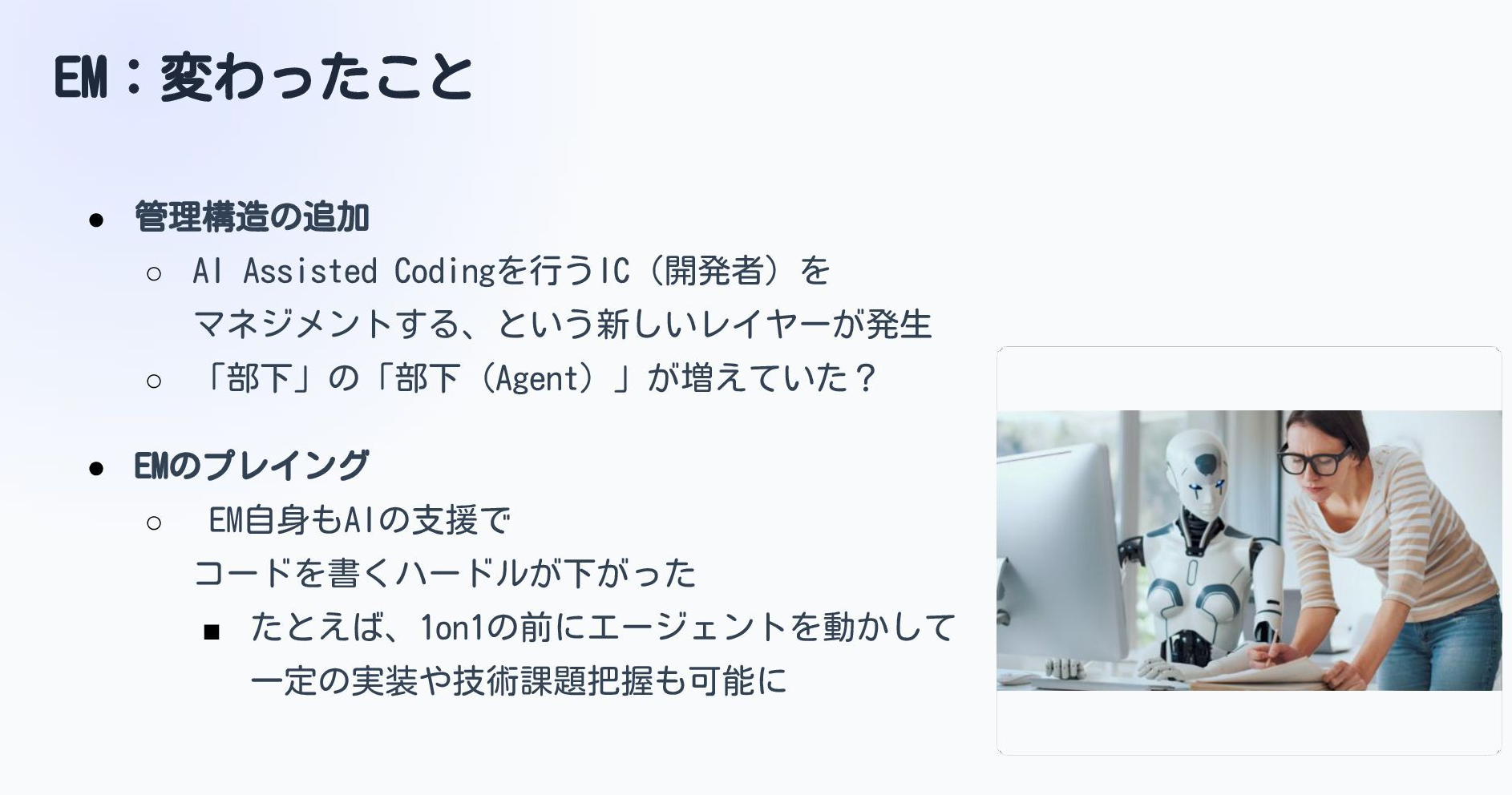 1つ目は、先ほど述べたように、デベロッパーが複数のコーディングエージェントを管理するようになったことです。それによってEMは、AI支援コーディングを行うIC(Individual Contributor)をマネジメントしていますが、その下にはAIエージェントがいます。バーチャルな部下が増えているんですね。マネジメントの対象が少し変わっていることを理解したうえで、動くのがいいと思います。