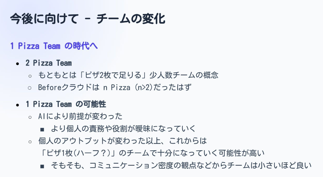 少人数のほうがコミュニケーション密度が高まるメリットがあるため、チーム規模はどんどん小さくなっていくでしょう。今後は「1 pizza team」になっていくと予想しています。もしかすると「half pizza team」になるかもしれません。