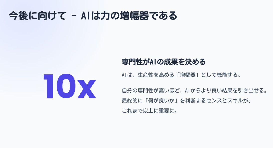 まず「AIは力の増幅器である」ということを押さえてください。デベロッパーのところで話した通り、自分の専門性があって初めて、AIは真価を発揮します。10の力がある人がAIを使えば20の力が出せますが、人の力が0.1だけでは、効果はもちろん限定的です。AIからより良い力を引き出すために、自身の専門性を磨くことが非常に重要です。