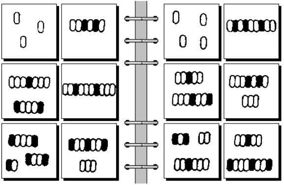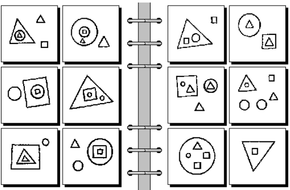 注意点としては、パネルの絶対位置は使わない。「左の上段の1つ目」とか「右の中段の2番目」のような指定は問題にならない。あくまで、左のパネルの集合と、右のパネルの集合で考える。さらに、幾何学的なパターンに限定し、「スプーンに似ている」といった人の知識に依存する問題はない。たとえ異星人がやってきても解けるというのが前提だ。