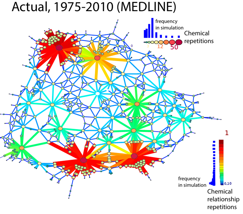 1975年〜2010年のMEDLINE(PubMedのデータベース)から、「生物医学分野で論文中に取り上げられた化学物質」をネットワーク化し、どのような探索戦略が効率的かを可視化したRzhetskyらの研究が紹介されている。