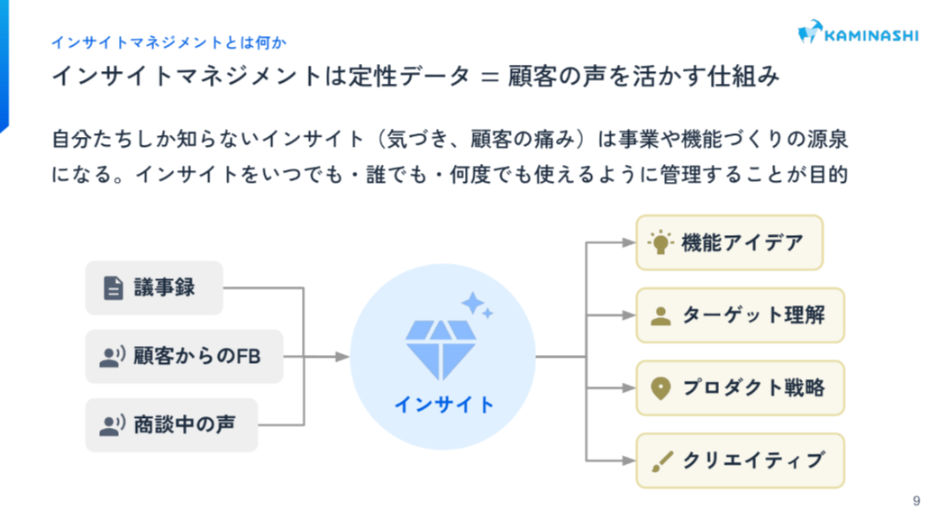「ユーザーインサイト」は事業や機能の価値を生み出す源泉です。インサイトマネジメントとは、担当者がユーザーとの会話で掴んだインサイトを「いつでも、誰でも、何度でも」使えるように管理していく手法と言えます。