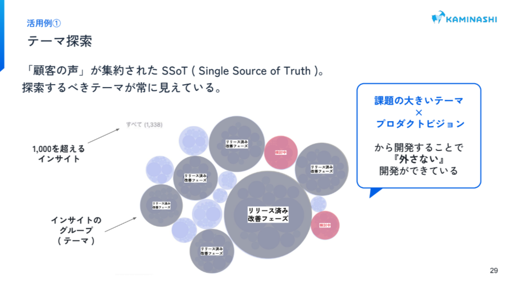 これらのインサイトをグルーピングして可視化すると、円の大きさが「顧客の声の量」を表します。そのため、基本的にはこの円が大きい順に開発の優先度をつけていけばいい、というシンプルな判断が可能になりました。