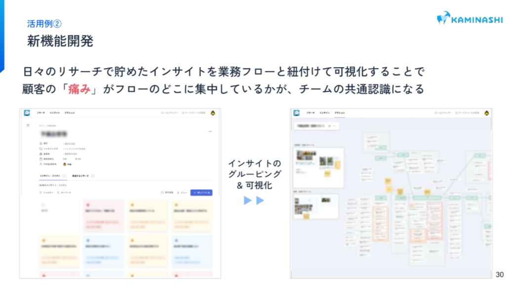 新規機能開発では、顧客の痛み(ペイン)の見極めが重要です。日々蓄積しているインサイトを業務フローと紐付けて管理することで、「どの業務にどのぐらいのペインがあるのか」が一目瞭然になります。