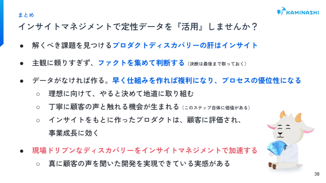 ぜひ皆さんもインサイトマネジメントを試してみてください。定性データの活用に一緒に取り組んでいけたら嬉しいです。