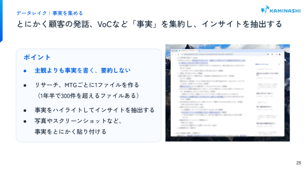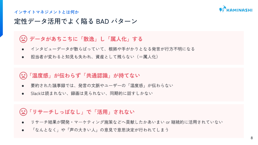 私がカミナシに入社した当初も、定性データの管理、共有、活用の方法をチーム内で確立できておらず、せっかく顧客の声を集めても、データが属人化しリサーチした人にしか納得感がない、というシーンを何度も見てきました。