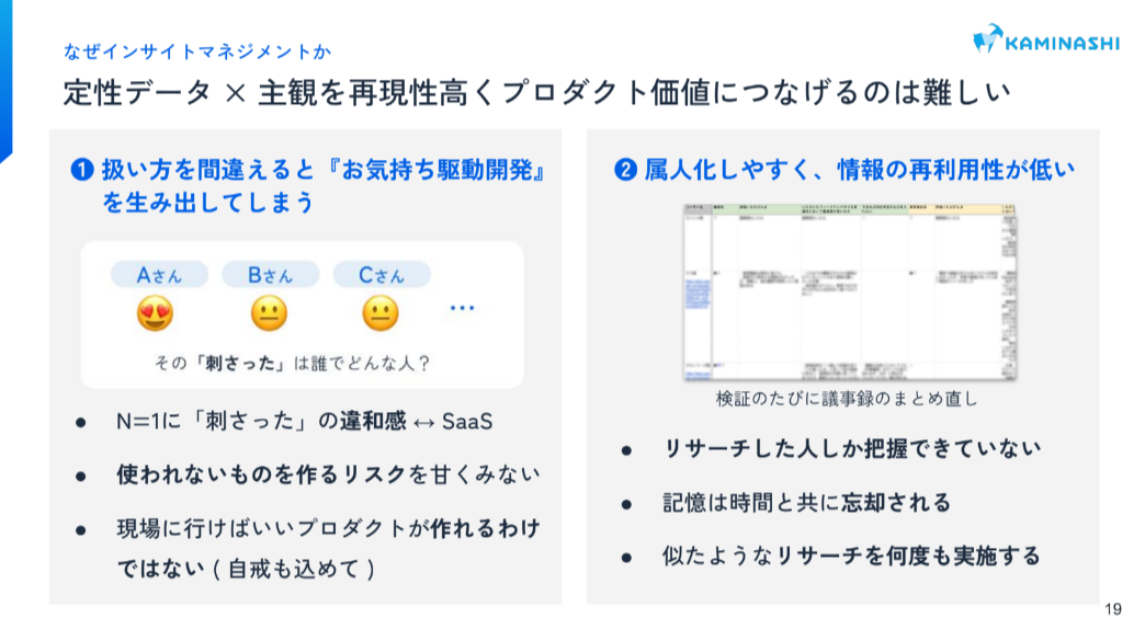 当然、集めた定性データをインサイトとしてプロダクト開発に活かしたいと考えます。しかし、主観の入りがちな定性データの扱いを間違えると、意思決定の再現性がなくなり、プロダクトの価値を継続的に生み出す難易度が上がっていくのです。