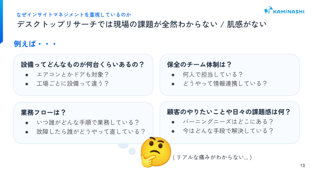 「カミナシ 設備保全」を立ち上げるときも、最初にぶち当たった壁が「デスクトップリサーチしても課題が全然分からない」ということでした。