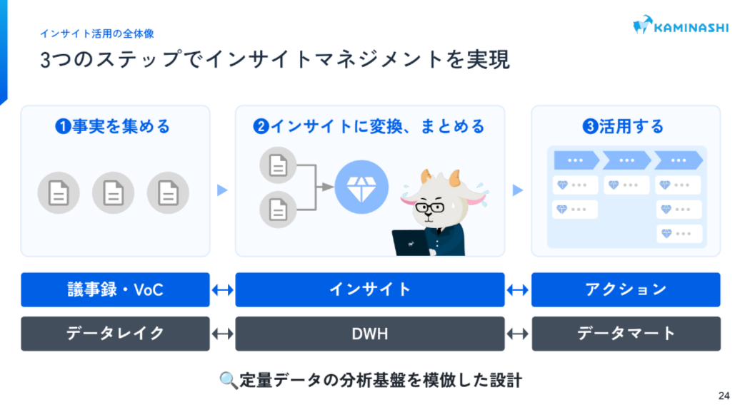 こうしたアンチパターンを避けるため、定量データの世界にある「データマネジメント」の仕組みを定性データに転用できないかと考えました。個別具体に見えがちな顧客の声を客観的な「ファクト」として集計・分析し、その「ファクト」をもとに判断したい。主観や直感に頼る意思決定は最後の重要な局面まで取っておきたい。それが、「インサイトマネジメント」の仕組みを取り入れた最大の理由でした。
