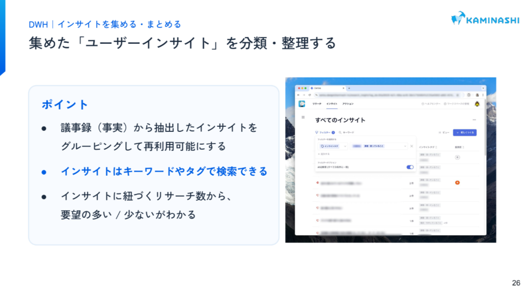 次に、収集した生データから、「インサイト」を抽出して分類・整理します。