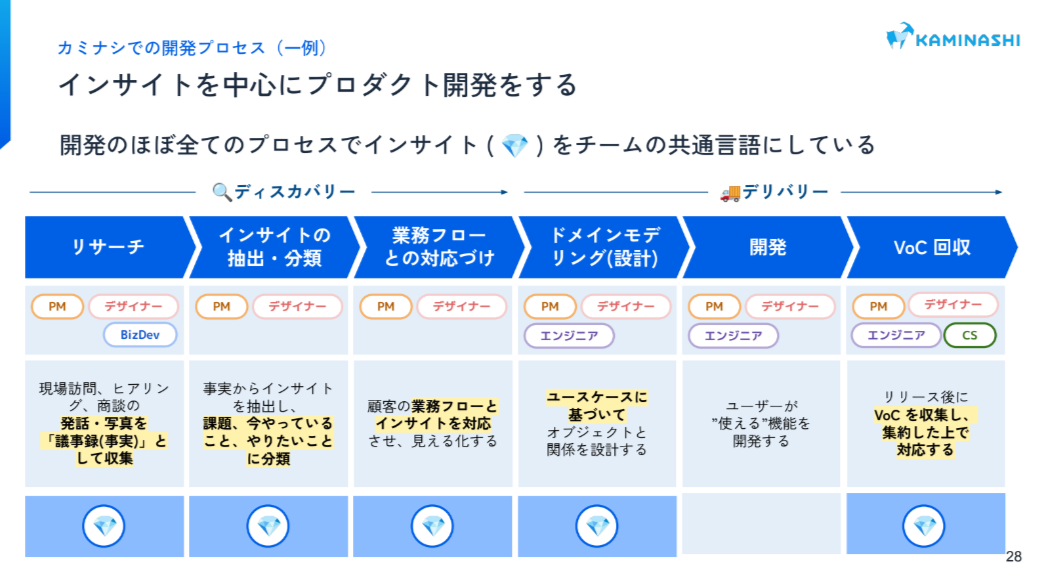 私のチームでは、PMやデザイナーだけでなく、エンジニア、カスタマーサクセス(CS)、BizDevなど、他の職種も巻き込みながら、インサイトをチームの共通言語にしています。これにより、リサーチからVoC回収まで、ほぼ全ての開発プロセスでインサイトを活用することができています。