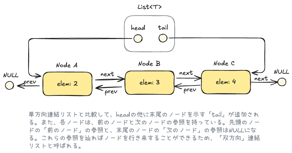 「次のノードへの参照」について補足ですが、自ノードが終端で次のノードを持たないケースがありえます。そのためこのポインタはNULLを考慮している必要があります。RustではOption型を使用することでNULLを考慮できます。