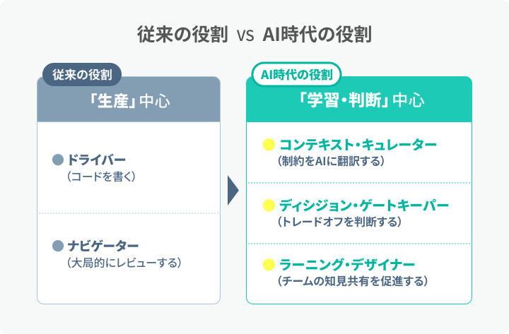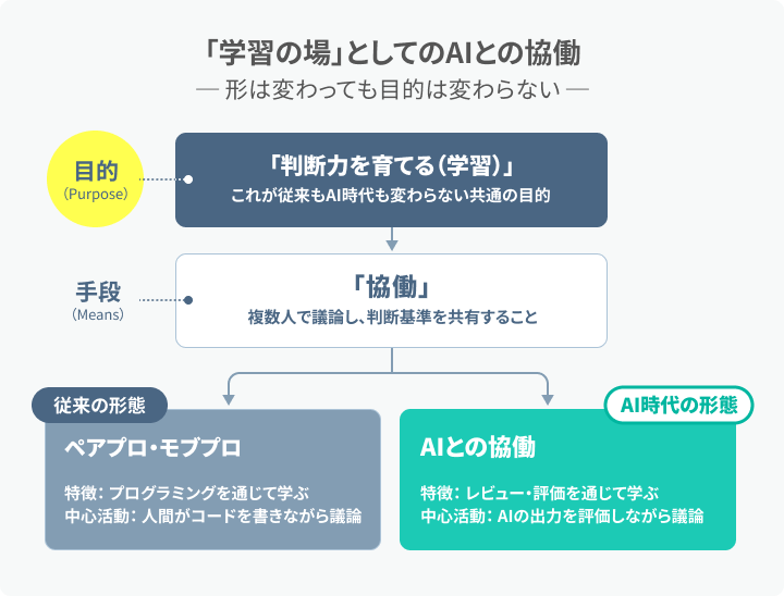 AI時代には、ペアプロ・モブプロを「学習の場」として捉え直すことが重要です。ペアプロ・モブプロには「コード生産」と「学習」の両面がありますが、従来は「コード生産の場」という文脈で語られがちでした。しかし、学習こそが判断力を養う手段であり、AI時代にはこの側面がより重要になると私は考えています。