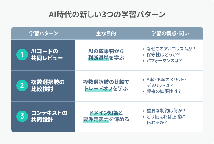 もちろん、AIに適切な指示や仕様を伝えること――いわゆるプロンプトエンジニアリング――は重要です。しかし、それは当然の前提であり、本稿のテーマではありません。適切な指示を書けたとしても、その先にある問いが残ります。AIの出力を評価し、判断を下せる人間をどう育てるか。筆者が本稿で論じたいのは、この問いへの答えです。なお、本稿で言う「学習」とは、座学ではなく、現場で判断できるようになるための実践的な学びを指します。