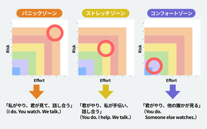 「3ヶ月前はここが『パニックゾーン』だったけど、今は『コンフォートゾーン』になったね」と視覚的に確認することで、後任者は自身の確実な成長を実感し、次の挑戦への意欲を高めることができます。