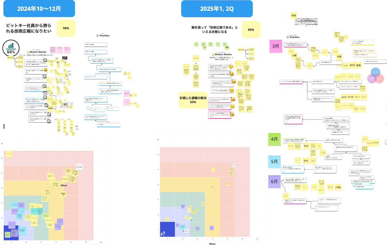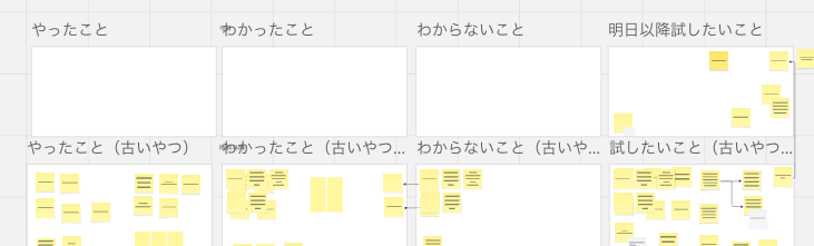 ホワイトボードツール上に、期間開始時の状態(Risk-Effortマトリクスやスキルマップ)のスナップショットを保持しておき、現在の状態と横並びにします。