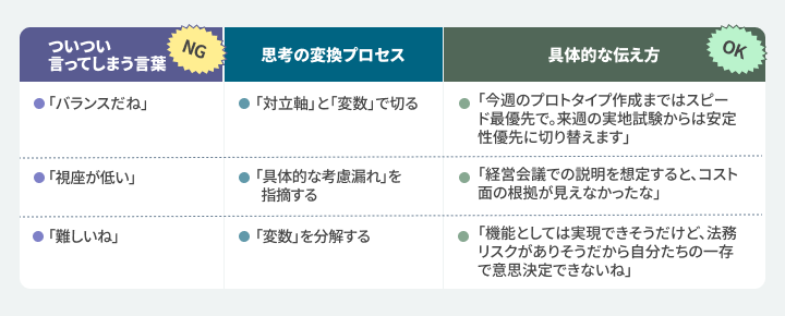 「この領域について一緒に考えたいので、少し時間をください」「どう伝えれば良いのか明日までにまとめてきます」と伝え、解決に向けた時間を確保します。