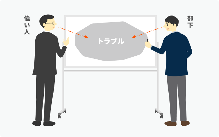 そこで、ホワイトボードを「人から問題を切り離す装置」として使うのだ。問題は、あなたや私が抱えているのではなく、ホワイトボード上、つまり私たちの間にあるのだ、という形だ。