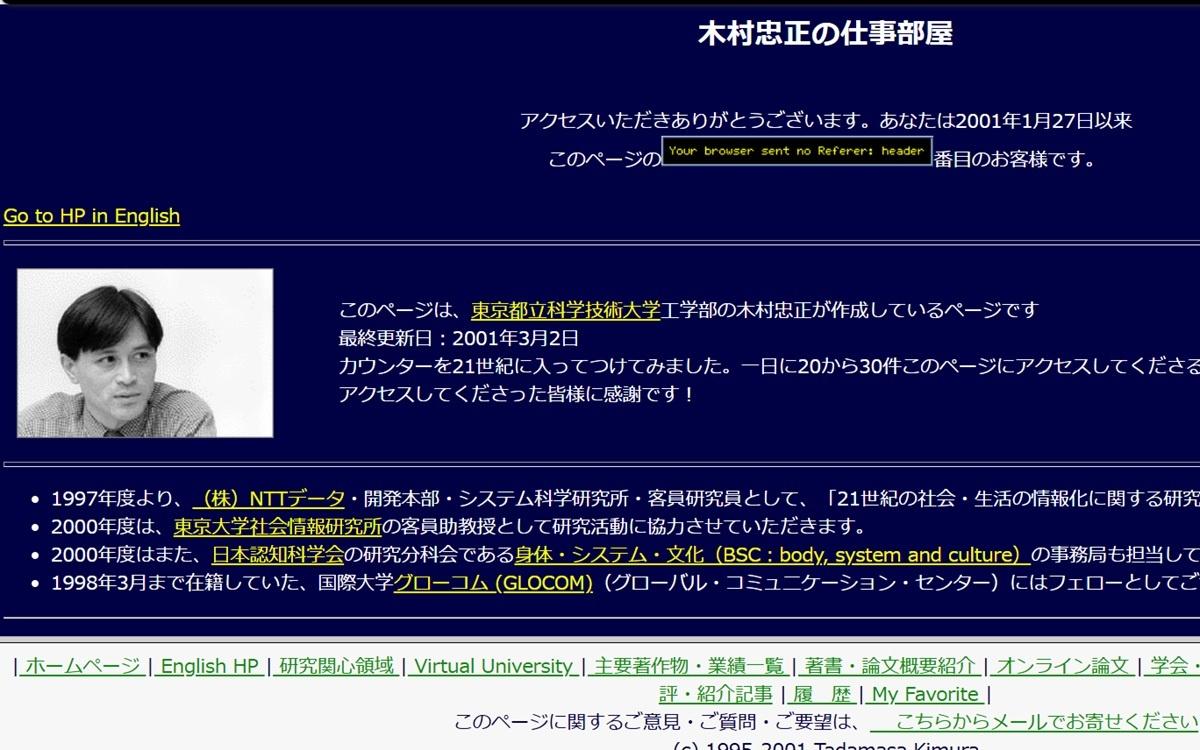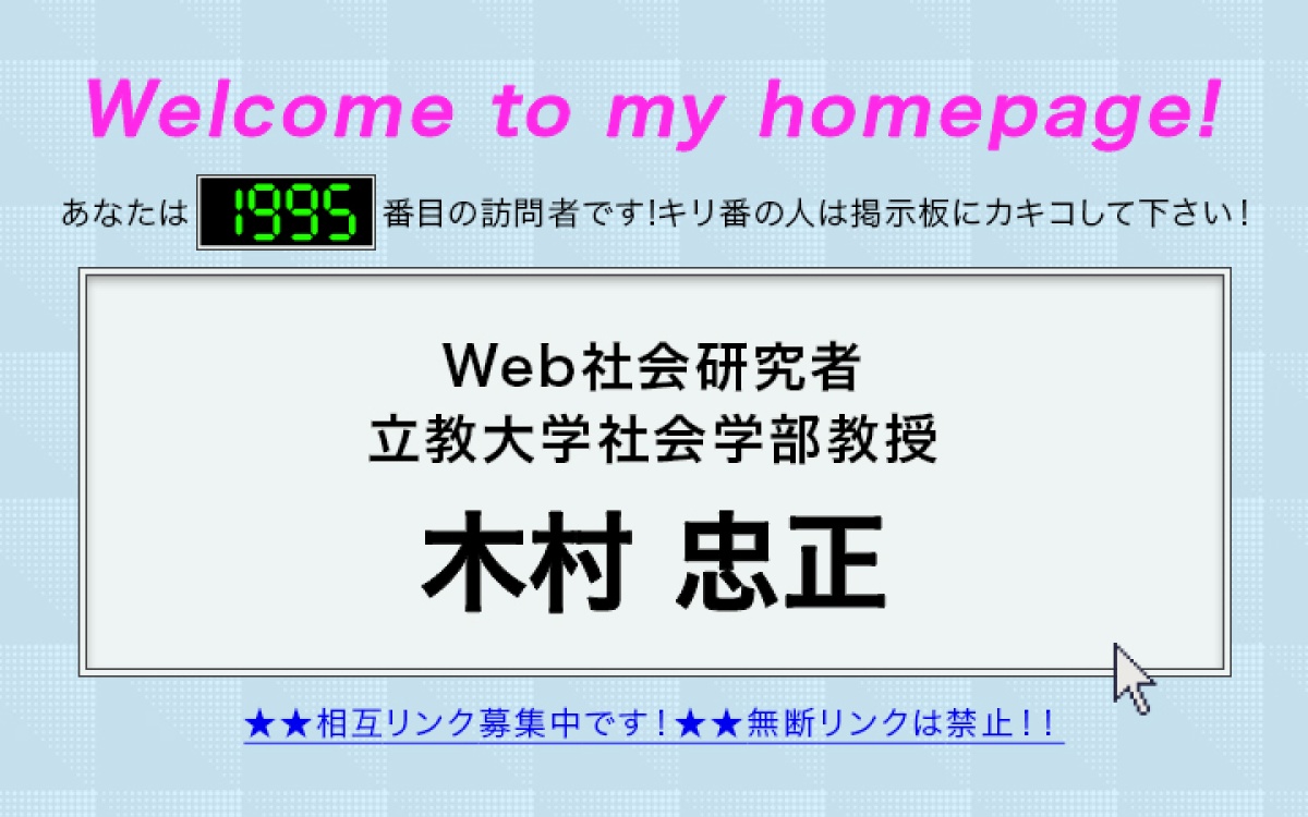 木村:まず、日本においてインターネットが本格的に普及しはじめたのは、1995年ごろからです。世界でも、World Wide Web(WWW)サーバーの指数関数的な増加が始まっていた時代でした。サイバースペースにおける人類学の研究に取り組み始めたばかりの私自身も、HTMLを手打ちで学び、1995年には自身の個人サイト「木村忠正の仕事部屋」を立ち上げてみたりしていました。そしてWindows 95の発売やISDNの普及により、一般の人がPCでインターネットに接続する技術的ハードルがどんどん下がり、個人が情報を発信する土壌が整っていきました。
