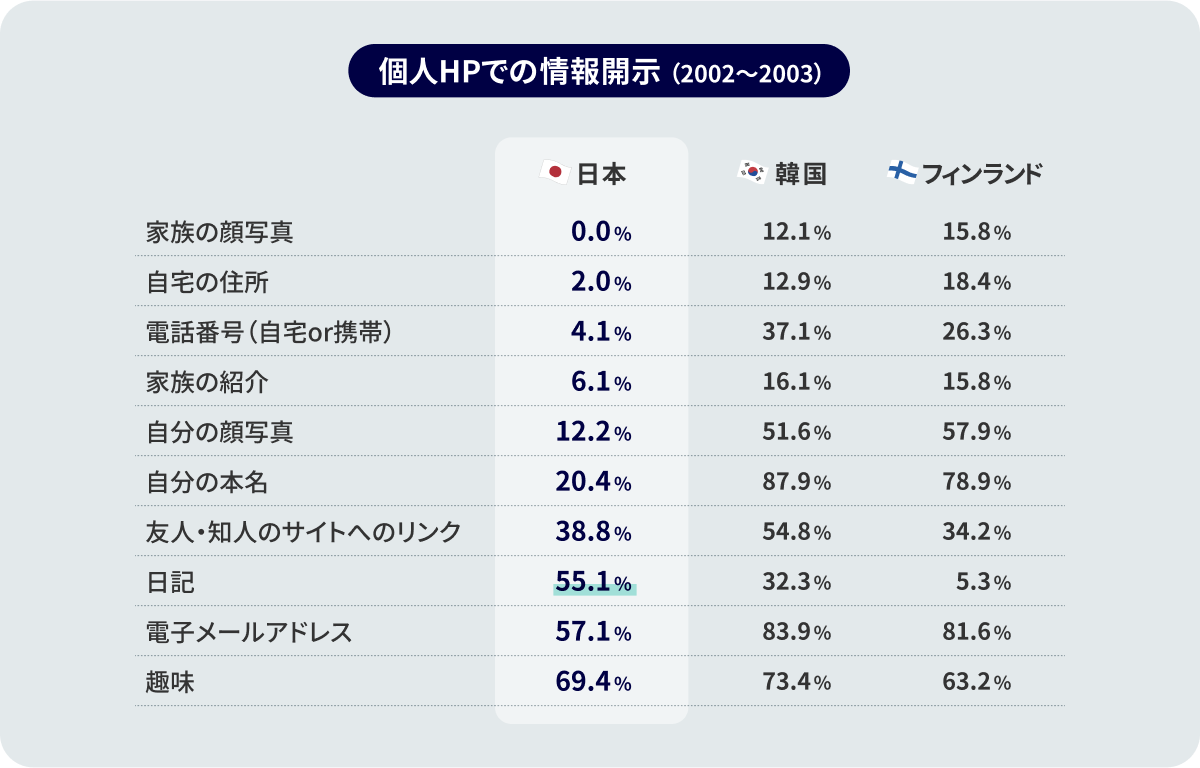 木村:こちらも当時の様子が伺えるデータとなるのですが、2003年に私が行った国際比較調査(※3)で、日本・韓国・フィンランドの個人サイトを保有する大学生たちが、どのような情報を公開しているかを比較したことがあります。