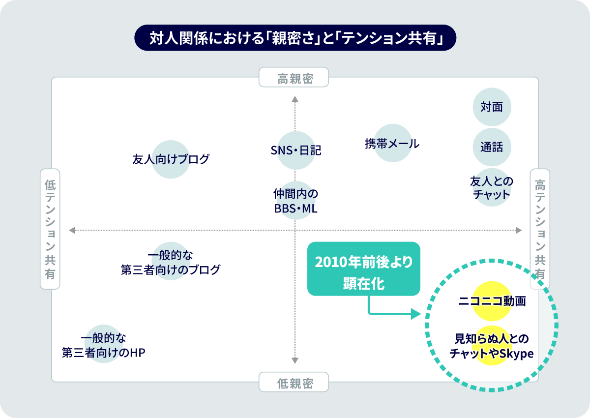 しかし、インターネットはこの構造を根本から変えました。コミュニケーションの手段が多様化し、「親密さ」の軸と「テンション共有」の軸が、それぞれ独立して動くようになったのです。