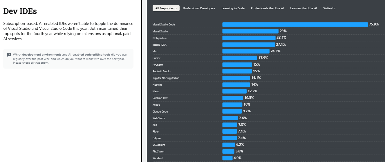 (※1)Stack Overflowの2025年度調査によれば、「開発用IDE」(エディタ含む調査)の項目では、ユーザーが過去1年以内に利用した、あるいは今後1年以内に利用したいと答えたIDEの1位がVSCode(75.9%)だった。2位Visual Studio(29%)、3位Notepad++(27.4%)。なお、同2015年度調査の「TEXT EDITOR」の項目によると、使用しているエディタは1位Notepad++で34.7%、2位Sublime Textで25.2%、3位Vimで15.2%。なお、4位のEmacs(3.8%)を挟んで、5位には既に開発を終了したAtom(2.8%)が名を連ねていた。