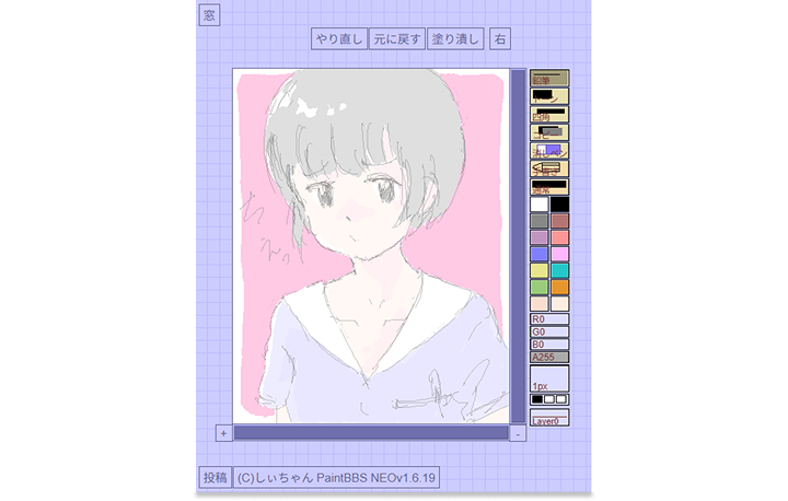 さとぴあ:そもそも、「お絵かき掲示板」はお絵かき掲示板というひとつのアートカテゴリなのだと思います。例えばPaintBBS特有のジャギーが出る1pxの線で描く人気イラストレーターの方が何名かいらっしゃいます。PaintBBS特有のあの線でなければ表現できないイラストレーターの方々が存在しているのです。