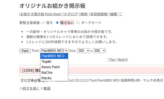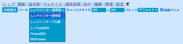 かつて私が愛用していたBBSNoteでは、PictureBBSやPaintBBSをはじめ複数のペイントツールをプルダウンから切り替え可能でした。それを、新しいHTML5+JavaScriptのペイントツールでも実現したかったのです。