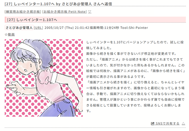 その後の2005年、私は現在も運営しているお絵かき掲示板交流サイトを開設しました。これらのお絵かき掲示板のペイントツールを導入して、多くの人々に使っていただきました。また自分でもイラストを描いて楽しんでいました。